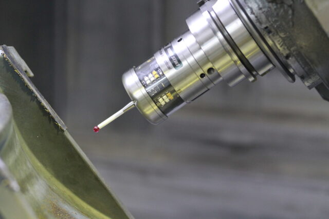 5軸加工機に搭載された計測装置でワークの取り付け位置や外形寸法のバラツキを自動測定し、加工プログラムの座標補正を行うことで高精度加工 を実現しました。